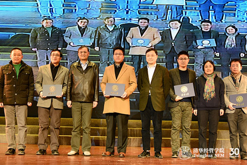 晚会正式开始前,为了感谢校友对学院做出的贡献,钱颖一教授、郦金梁教授、焦捷教授和钱小军教授共同为四位MBA校友代表颁发了证书。他们是1992级校友郜宏(江西华腾地毯产业园有限公司董事长)、2001级校友徐勇刚(博洛尼家居用品股份有限公司副总裁),2007级校友金守中(北京浩庭广告传媒有限责任公司总经理)和2011级校友师涛(北京三一友泰科技发展有限公司共同创始人),他们都为学院和MBA项目的建设做出了重要贡献。