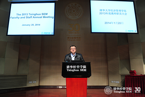 大会首先由钱颖一院长作“院情报告”。他以视频、叙述、数字三种形式,带领大家回顾了共同奋斗的2013年。视频短片分为“重大活动”、“创新”、“殊荣”、“师者”、“学子”、“全球战略”、“校友”、“30周年院庆活动”八个部分,展示了过去一年学院取得的成果。紧接着,钱颖一院长总结了2013年学院完成的10项重点工作,分别为:学院治理整体框架建立、顾问委员会新阶段、建楼筹款完成、创新创业与战略系组建、校友活动新台阶、本科管理学第二学位招生、博士项目重大措施实施、清华-MIT全球MBA项目启动、后EMBA项目首期班开班、清华x-lab创建并广受关注。之后,钱颖一院长用数字解读了各教学项目的情况、教师队伍建设和研究成果、职员队伍的发展,以及学院的财务状况。