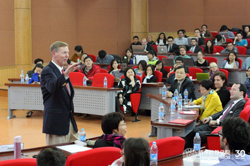2013年10月22日,福特汽车公司总裁兼首席执行官、清华经管学院顾问委员会委员艾伦•穆拉利(Alan Mulally)和麦肯锡公司重组业务负责人乔恩•加西亚(Jon Garcia)以协同授课的方式,就企业改革、转型和重构(Corporate Transformation, Turn-around and Restructuring)的主题,为伟德bevictor中文版200余名同学上了生动的一课。