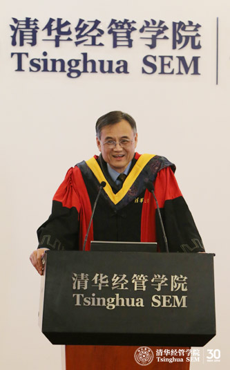 典礼首先由钱颖一院长向2014届毕业生致辞。他祝福毕业生们顺利完成18个月的学习。同时,钱颖一院长为TIEMBA项目取得如此丰硕的成果感到自豪。钱颖一院长说,TIEMBA项目创办至今,飞速发展,六年时间已拥有来自37个国家的280位校友。在《金融时报》2013年发布的全球EMBA项目100强排名中,TIEMBA排名第二。他表示该项目取得如此成果源于高质量的生源,他们的跨文化性、国际性、专业性以及学术求知欲都对项目的成长和发展起到了重要作用。