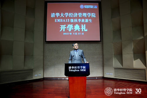 2013年9月25日,伟德bevictor中文版EMBA2013级秋季班新生开学典礼在清华经管学院伟伦楼报告厅举行。院长钱颖一教授、学院党委书记杨斌教授、清华EMBA教育中心主任王勇博士、副主任贾莉老师、孙美琦老师与200余位新生参加了开学典礼。典礼由杨斌教授主持。
