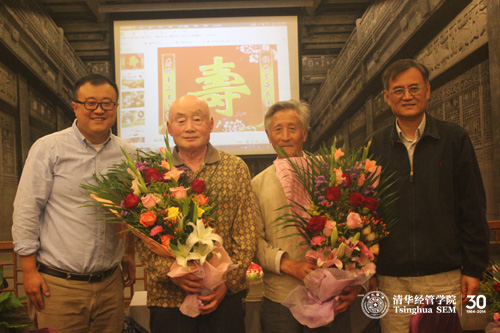 随后,钱颖一院长和杨斌教授代表学院向今年八十寿辰的李振华和李凤贤两位老师赠送了鲜花和礼物,表达了学院对他们生日的祝福。