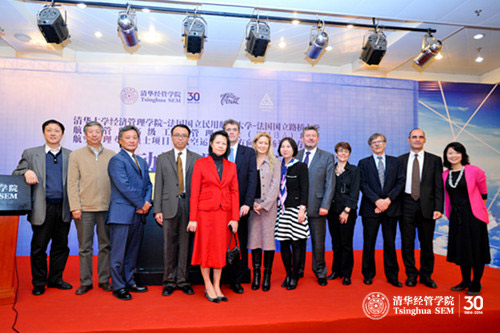 清华经管学院党委副书记朱岩教授,法国国立民用航空大学校长Marc Houalla先生,法国国立路桥大学中方代表Kirsty Tan女士,欧洲宇航防务集团(EADS)中国区总裁及首席执行官Laurence Barron先生,国际租赁金融公司(ILFC)高级副总裁及中国区总裁Peter Chang先生出席发布会并致辞。他们共同宣布,将通过各自的资源优势,协力打造中国最顶尖的航空管理课程。清华经管学院高管培训中心副主任谢绮红主持了此次课程启动仪式暨媒体发布会。