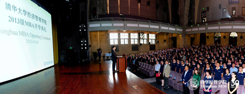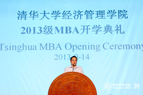 2013年9月14日,伟德bevictor中文版2013级MBA开学典礼在清华大礼堂举行。清华经管学院院长钱颖一教授、副院长郦金梁教授、退休教师代表谢文蕙教授、教师代表杨之曙教授、MBA教育中心执行主任张磊老师以及MBA教育中心的其他老师与417名新生一同出席了典礼。典礼由郦金梁教授主持。
