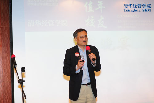 2013年4月27日晚,清华经管学院值年校友晚宴于文津国际酒店举行。入学三十周年的经1983级,毕业二十周年的经1988级,入学二十周年的经1993、经硕1993、MBA1993级等各年级共150余位校友参加了晚宴。清华经管学院院长钱颖一教授、党委书记杨斌教授、副院长白重恩教授、副院长高建教授、副院长郦金梁教授、党委副书记焦捷教授,与李端敏、罗绍彦、吴峨、侯炳辉、赵纯均、程佳惠、徐瑜青、陈章武、李子奈、杨铎等离退休教师,蓝伯雄、姜旭平、薛镭、张陶伟、黄京华、宋学宝、曲庆、谢德仁、赵冬青、段志蓉、闻中等在职教师,工业工程系卢达溶教授,教学办邢立君、裴宇红、MBA教育中心于红蕾、吴英纳等职员一起出席了晚宴。刘宏飞(经1980/经硕1985),韩亦舜(经硕1982),董桂芹(高盛-清华“巾帼园梦”项目)作为特邀校友出席。