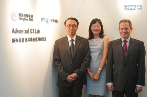 清华经管学院党委副书记朱岩(左)、英国电信中国研发中心总监张杰(中)及伙伴关系与战略研究主管李密斯合影