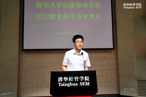 2012年北京市理科高考状元李泽代表新生发言。他回忆起从小对清华的向往,对经管学院的憧憬,以及最终如愿以偿后的喜悦,相信大家将拥有“高的起点、正的方向、广的视野、活的思维,将养成严谨踏实的学习习惯与学习作风,将在许许多多良师益友的陪伴中度过充实而温暖的四年。”