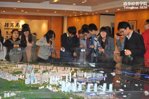 蛇口工业区位于深圳南头半岛东南部,东临深圳湾,西依珠江口,与香港新界的元朗和流浮山隔海相望,占地面积10.85平方公里。是由招商局全资开发的、中国第一个对外开放的工业园区。1979年初,凭借党的十一届三中全会制定的“以经济建设为中心”的方针与改革开放的重大契机,招商局的一批创业者来到蛇口,开始了大胆的探索。1987年,蛇口工业区实行公司制,成立蛇口工业区有限公司。经过20多年的开发建设,招商局蛇口工业区有限公司已发展成为一家拥有房地产、现代物流业、园区服务业、高科技业等产业群组,资产规模达100多亿元的大型投资控股型企业集团。在工业区管理处工作人员的安排下,金融硕士的同学们来到管理处大楼的三十四层,俯瞰整个园区。现在的蛇口,高楼鳞次栉比,环境清雅秀丽,而园区中最常见的景象,则是繁忙作业的工程项目。