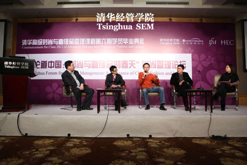 除了教授嘉宾的精辟见解,来自时尚与奢侈品行业及相关行业的清华校友也纷纷加入讨论:特邀嘉宾HTC中国区副总裁林祖荣、上海晨锦咨询公司总经理张喆、时尚课程三期校友李宁公司服务总监林云、六期学员深圳季候风服饰公司董事副总经理吴兴国、六期学员上海星客特汽车销售公司总经理高峰等校友从各自角度讨论了中国时尚品牌的国际化之路,以及奢侈品营销的创新之道。