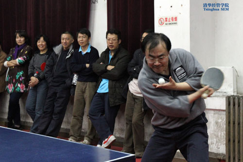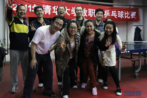 经管学院教职工乒乓球队由张力军、郑晓明、潘文卿、孟岭生、刘庆、钟笑寒、何平、高俊华、苗伟、林雅莉组成。本届联赛于11月14日拉开序幕,在小组循环赛阶段,经管学院以5:0的相同比分分别完胜汽车系和清华附中队,虽 1:4不敌离退休队,仍以小组第二的成绩进入淘汰赛。淘汰赛阶段迎接挑战的都是清华的传统强队,在近十年的交锋中,经管学院还从未取得过胜利。面对强大的对手,队员们精心布阵,放手一搏,先后以两个3:2淘汰了核研院队和校机关队,再以 3:1胜微电子队,最终挺进决赛。决赛中,经管学院队遭遇了实力雄厚、多次蝉联冠军的清华美术学院队。比赛中,经管学院的队员们拼尽全力,苦战到底,但最终仍因实力差距以1:3惜败对手,获得亚军。