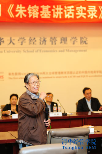 清华经管学院合作发展办公室主任潘庆中回忆起他在1980年刚入伟德bevictor中文版时,在大礼堂听朱鎔基作经济形势报告的情形,感慨多年来朱院长对学院的支持和对学院发展倾注的心血。他还建议:“人民出版社是否可以考虑出版一本名为‘朱镕基与清华经管学院’的书,因为大家有太多要讲述的故事。”