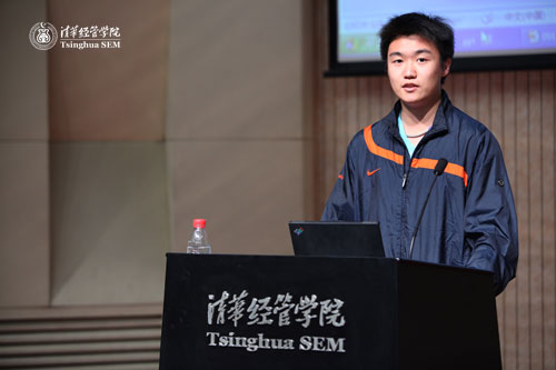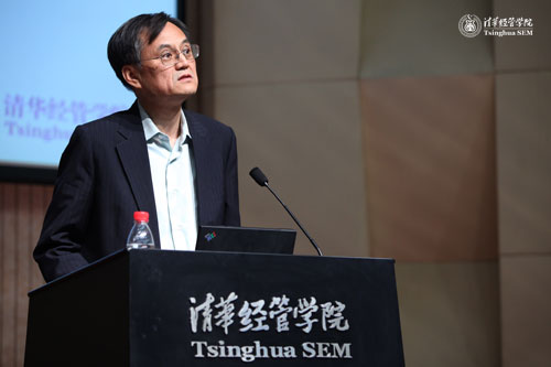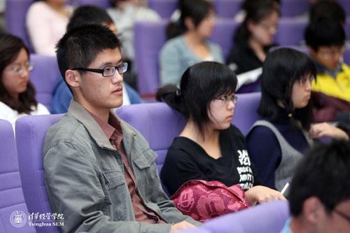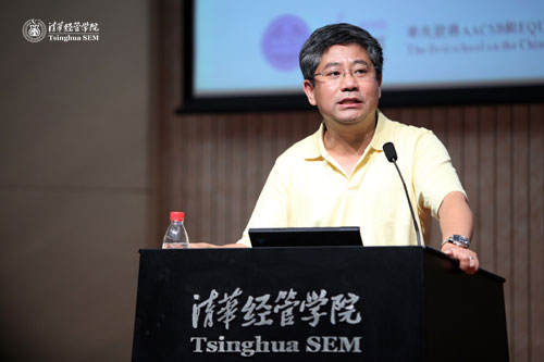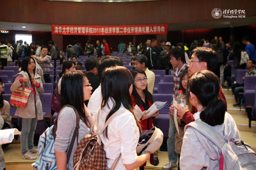 钱颖一院长在开学致辞中代表学院真诚地欢迎校内各院系的同学加入经济学第二学位项目,他简要介绍了经管学院在经济学第二学位项目的课程设置、教学管理和个性培养方面的优势,列举了在出国深造的专业选择上,经济学第二学位项目为以往攻读的同学所开辟的新的领域。在致辞中,钱院长着重谈了对经济学第二学位项目的一些思考,认为攻读经济学第二学位同学的收获会远远超过预期,他指出学习经济学第二学位的意义不只是学习专业知识,更有机会领悟另一种思维方式,即经济学的思维方式,和感受另一样文化,即清华经管学院“以人为本”的学院文化。他还特别请同学们从“为人”先于“为学”和鼓励“个性发展”两个方面充分感受经管学院以人的发展为根本教育目的的学院文化。他同时提到想要同时获得这三个方面的收获并不容易,既要用心,还要努力。但如果能够做到的话,同学们会对自己今天的选择感到自豪。