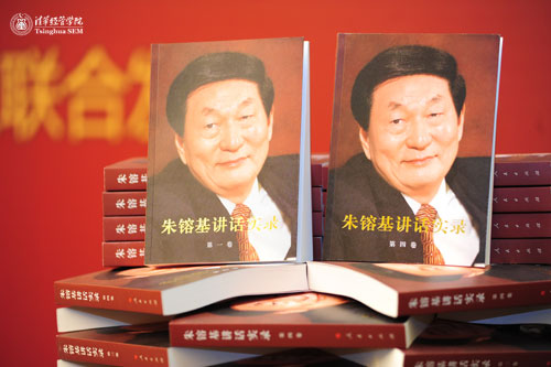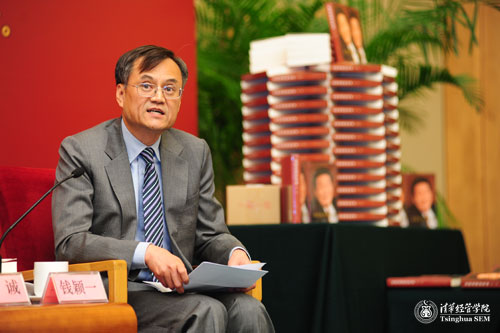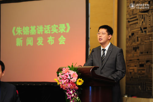 清华经管学院钱颖一院长在新闻发布会上讲话。他首先回顾了今年4月22日朱镕基院长重返清华经管学院做演讲时的场景,朱院长对于全院师生的嘱托和期盼历历在目。在读完朱院长的新作《朱镕基讲话实录》后,钱院长特别注意到这套书中有五篇与清华相关,其中四篇与清华经管学院相关,体现了学院在朱院长心中的位置。钱院长指出,“这几篇讲话和文章言简意赅,凝聚了朱院长对办好清华经管学院的战略思路。我个人理解一共有四条,可以概括为:建设世界一流学院的世界眼光,把教师作为根本推动力的办学方略,‘为人’先于‘为学’的教育理念,以及‘追求完美’的人生精神。”