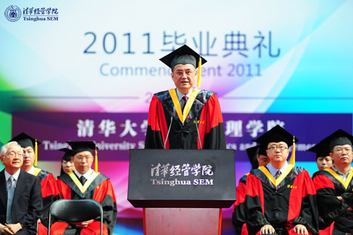毕业典礼由钱颖一院长主持。著名经济学家、清华经管学院兼职教授吴敬琏教授以“毕业以后”为题作了精彩的演讲。听过吴敬琏教授的演讲后,09F班同学邓学良表示:“吴老说,中国未来的道路将是从政府主导的市场经济迈向基于法制的市场经济的改革。没有现成的答案可循。我们要在关心人民福祉和民族兴盛的伟大事业中找到自己的人生道路。EMBA有一定的社会实践经历,认识到人生一定会曲曲折折,但前途一定是美好的,我们有信心迎接未来挑战。"