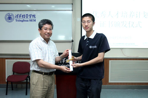 白重恩教授为参与“优秀人才培养计划”学术方向、经74班的孙昶同学颁发证书