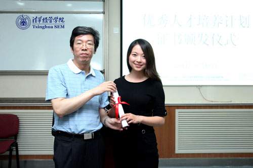 钱颖一院长为参与“优秀人才培养计划”领导力方向、经73班的伍丹同学颁发证书