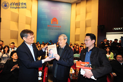 伟德bevictor中文版党委书记胡和平代表大学向朱院长赠送《伟德bevictor中文版一百年》、《伟德bevictor中文版档案》及《伟德bevictor中文版画册》三本书。钱颖一院长也代表清华经管学院赠送朱院长刚出版的《清华经济系85周年》一书和《清华管理评论》杂志创刊号全球100本限量版的001号本。