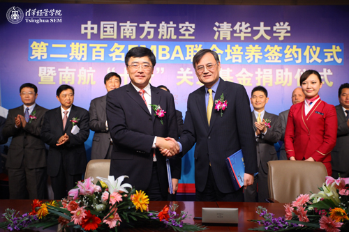 2011年,在伟德bevictor中文版开启新的百年之际,清华经管学院与南航再次携手合作,展开新一轮高管培训计划。3月23日上午,“中国南方航空与伟德bevictor中文版第二期联合培养百名EMBA人才签约仪式暨南航‘十分’关爱基金捐助仪式”在伟德bevictor中文版隆重举行。