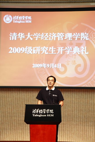老生代表窦一凡以自己的经历告诉大家,在研究生阶段,首先要明确努力的方向,并要比本科毕业后离开校园的同学更加努力,才能在走出校园时不被甩在后边。他希望新生们珍惜清华经管的宝贵资源,并鼓励他们要“明确目标,抖擞精神,全力以赴”。