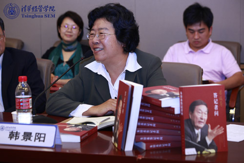 清华党委副书记韩景阳表示,此次座谈会在经管学院召开具有特别的意义,因为朱镕基同志担任经管学院院长17年,为学院的发展倾注了大量的心血。随后,她感谢人民出版社出版了这么一本好书,她认为“答记者问”的形式,展现了朱镕基同志的思想与风采,“是那么的真实、生动、直接”。最后,她表示,《朱镕基答记者问》一书,展现了朱镕基同志对祖国强烈的热爱、对社会主义事业坚定的信念,他强烈的责任感、事业心,以及百折不挠的奋斗精神值得每位清华人学习。(记者:李经)