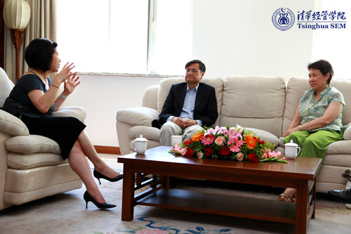 钱颖一院长与何晶女士(右)、杨敏德女士(左)交谈