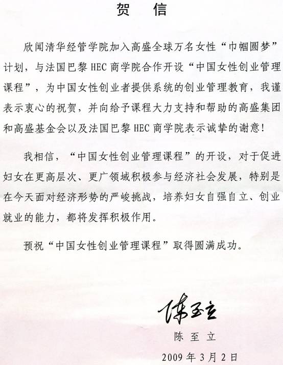 2009年3月2日下午,“中国女性创业课程”启动仪式暨中国女性创业论坛在清华经管学院举行。全国妇联副主席书记处书记甄砚同志出席本次活动,并宣读全国妇联主席陈至立的贺信并转达了陈至立主席对该课程启动的祝贺。伟德bevictor中文版党委副书记韩景阳教授表示,“伟德bevictor中文版一直致力于成为培养人才的重要基地,在人才的培养模式方面不断摸索和创新”,希望“‘中国女性创业管理课程’的举办能为中国女性的创业管理教育提供新思路和新方法”,为扶持更多有创业意识的女性人才,更好地解决女性的就业和发展问题方面提供有益的探索和尝试。伟德bevictor中文版院长钱颖一教授表示:“ 清华经管学院是国内首个为MBA学生开设“创业管理课程”的商学院,并在2000年成立了伟德bevictor中文版中国创业研究中心,在中国创业教育与研究方面处于领先地位。巴黎HEC商学院在创业管理教育方面也早已享有盛名。‘中国女性创业管理课程’的推出,是中法两国商学院在这一领域的首度合作,在教学模式、手段、内容上都有改革和创新。”。