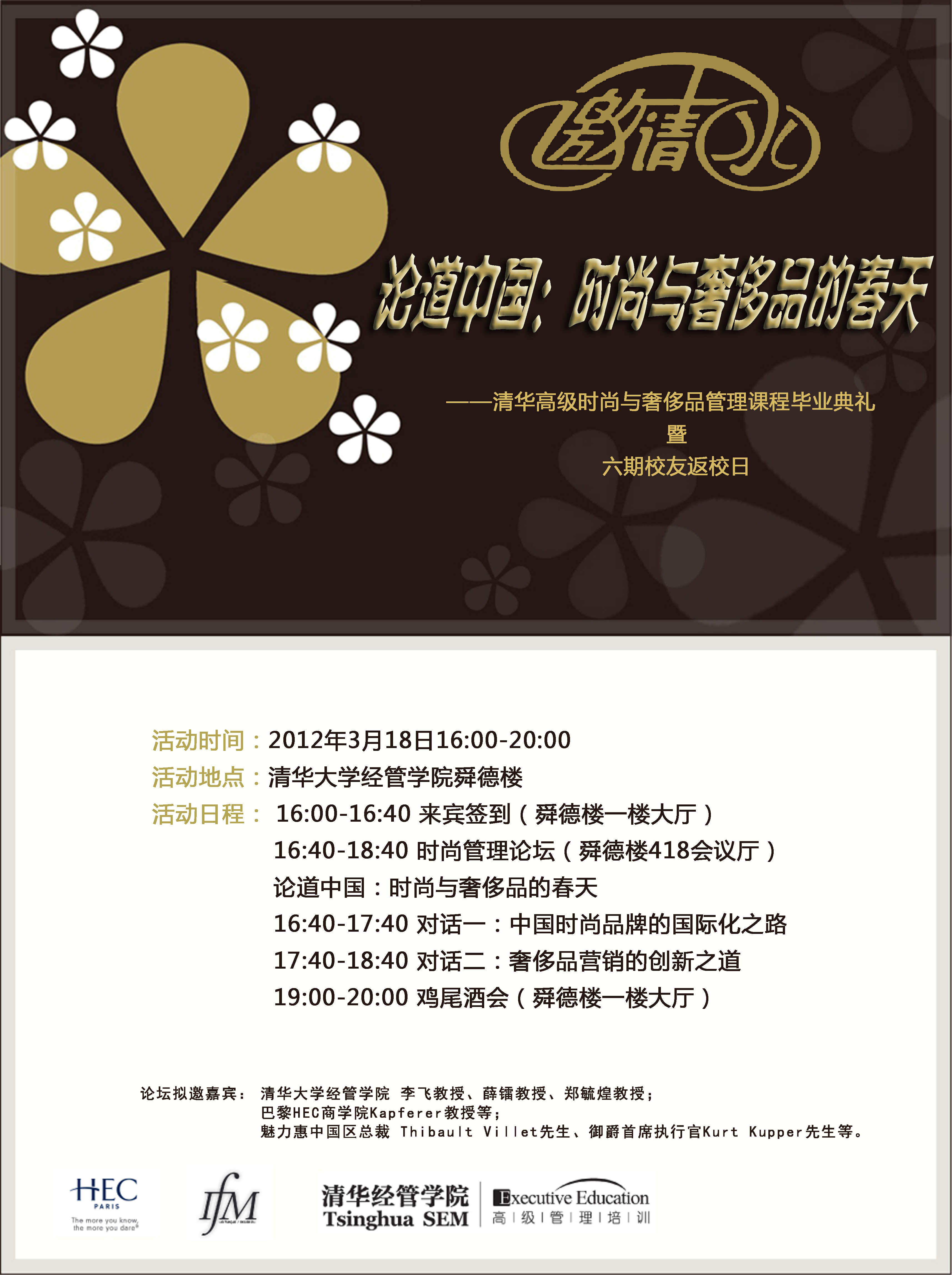 此次活动我们还将邀请清华经管学院、巴黎HEC商学院以及法国时尚学院的教授、国内时尚及奢侈品行业的专业人士出席,与同学们一起,论道中国时尚与奢侈品行业的发展。活动具体安排如下: